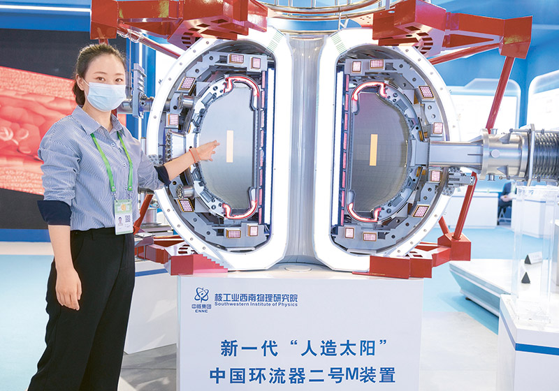 科技創(chuàng)新為高質(zhì)量發(fā)展注入強勁動能,助力創(chuàng)新型國家建設(shè)新征程。圖為2021年10月21日,在北京展覽館舉行的國家“十三五”科技創(chuàng)新成就展上,工作人員介紹新一代“人造太陽”中國環(huán)流器二號M裝置。中國環(huán)流器二號M裝置是我國目前規(guī)模最大、參數(shù)最高的新一代先進磁約束核聚變實驗研究裝置,等離子體離子溫度可達到1.5億攝氏度,是實現(xiàn)我國核聚變能開發(fā)事業(yè)跨越式發(fā)展的重要依托裝置?!⌒氯A社記者 才揚/攝