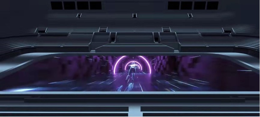 國家體育館內(nèi),在球員出場投影秀中,立體科幻的能量立方在冰面穿梭后,與冰墩墩相遇在太空,配上具有力量感的背景音樂《再戰(zhàn)》,展示出冰球運動的磅礴氣勢。