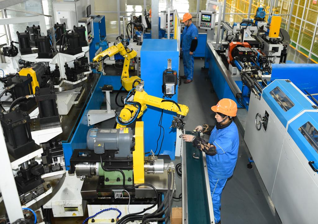 2月14日,在位于浙江省湖州市吳興區(qū)的金洲管道科技股份有限公司,工作人員和智能機(jī)器人協(xié)作生產(chǎn)不銹鋼管件。新華社記者 翁忻旸 攝