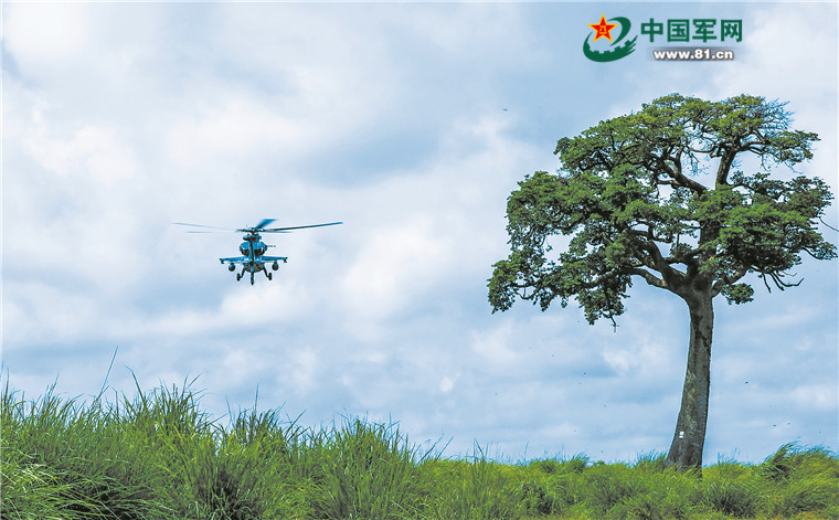 第74集團軍某陸航旅一架戰(zhàn)鷹掠過樹梢,飛向海邊。侯向坤、欒 鋮攝影報道