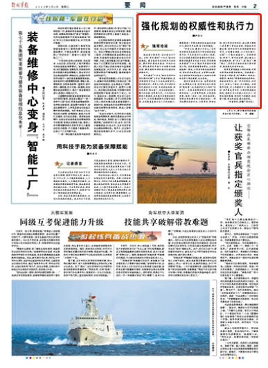 軍隊(duì)建設(shè)“十四五”規(guī)劃是國(guó)防和軍隊(duì)現(xiàn)代化新“三步走”的起步規(guī)劃,是實(shí)現(xiàn)建軍百年奮斗目標(biāo)的藍(lán)圖設(shè)計(jì)。落實(shí)規(guī)劃是一項(xiàng)宏大工程,涉及國(guó)防和軍隊(duì)建設(shè)各個(gè)方面,不但系統(tǒng)性強(qiáng)、涉及因素多、牽扯面廣,而且任務(wù)體量大、能力標(biāo)準(zhǔn)高、時(shí)限要求緊。無(wú)論是加快新型力量建設(shè),還是提升武器裝備現(xiàn)代化水平;無(wú)論是推進(jìn)現(xiàn)代后勤縱深發(fā)展,還是提高備戰(zhàn)打仗人才供給能力,都需要進(jìn)一步強(qiáng)化規(guī)劃的權(quán)威性和執(zhí)行力,搞好科學(xué)統(tǒng)籌,有力有序推進(jìn)。