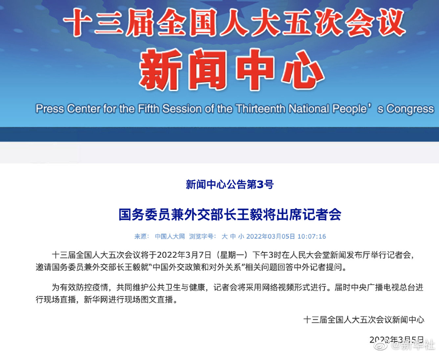 十三屆全國人大五次會(huì)議將于3月7日(星期一)下午3時(shí)在人民大會(huì)堂新聞發(fā)布廳舉行記者會(huì),邀請(qǐng)國務(wù)委員兼外交部長(zhǎng)王毅就“中國外交政策和對(duì)外關(guān)系”相關(guān)問題回答中外記者提問。