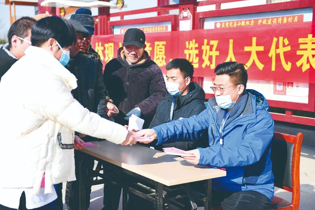 山東省臨沂市郯城縣縣鄉(xiāng)人大代表換屆選舉投票日,工作人員在馬頭鎮(zhèn)馬東選區(qū)投票站發(fā)放“選民證”。(圖片來源:人民視覺)