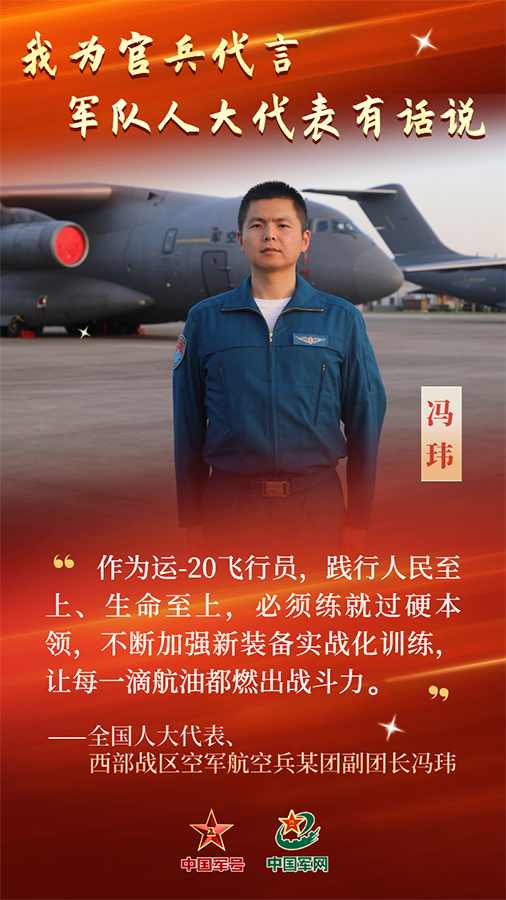 身為軍隊(duì)人大代表,馮瑋始終密切關(guān)注戰(zhàn)略投送力量的有效運(yùn)用,關(guān)注和空軍官兵相關(guān)的各項(xiàng)政策制度,今年提出“關(guān)于優(yōu)化戰(zhàn)略運(yùn)輸機(jī)使用”“在重點(diǎn)民航機(jī)場(chǎng)預(yù)設(shè)軍用運(yùn)輸機(jī)保障裝(設(shè))備”“增加隨機(jī)工作人員補(bǔ)助”等建議,助力人民空軍提升打贏能力。