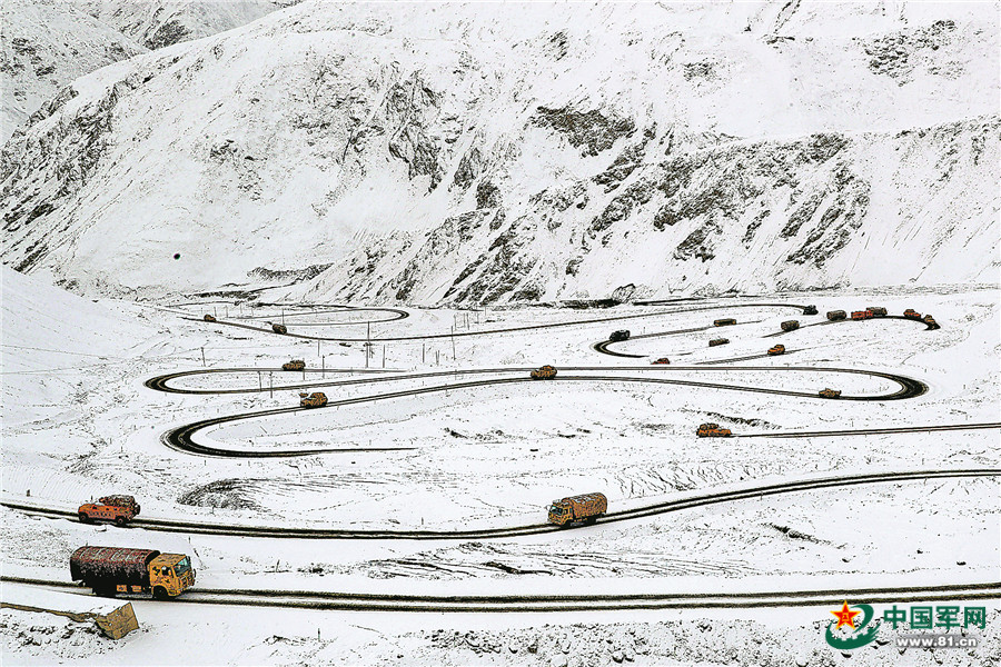 新疆軍區(qū)某部官兵向高原哨所運輸物資。曾令俊攝