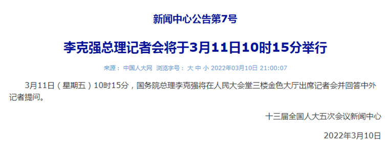 李克強(qiáng)總理記者會將于3月11日10時15分舉行