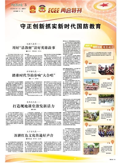 “學生在完成每天的功課之余,也希望有拓展課可以學習到課本之外的知識。為此,學校有針對性地開展國防教育活動,為學生開啟一片新天地,在增強他們基本軍事素養(yǎng)的同時,也讓關心國防、熱愛國防、建設國防、保衛(wèi)國防成為學生的思想共識和行動自覺?!毙烊A錚代表說,通過對學生開展涵蓋我軍歷史、國防政策、武器裝備、網絡安全等內容的專題輔導,一方面能夠點燃學生關心關注國防的熱情,達到普及國防知識的目的;另一方面,也在一定程度上擴大了國防教育的覆蓋面和影響力,為學生播下參軍入伍、獻身國防的希望種子。