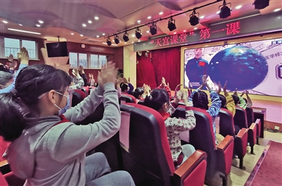 昨日,學(xué)生們?cè)诒本┲袊?guó)科技館聽(tīng)課。當(dāng)日,“天宮課堂”第一課開(kāi)課,神舟十三號(hào)乘組航天員翟志剛、王亞平、葉光富在空間站進(jìn)行太空授課。新華社記者 金立旺 攝