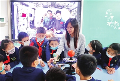 “同學們,大家知道中國空間站的位置在哪里嗎?”昨天下午,“天宮課堂”開課前,天津科技館天文教師宋媛媛走進河西區(qū)平山道小學,為學生們進行了一次太空科普教育。她利用三球儀模型幫助學生們建立起空間概念,隨后向大家介紹了中國空間站的運動軌跡。