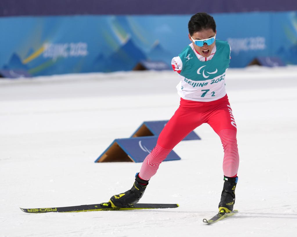 3月13日,中國隊(duì)選手王晨陽在北京冬殘奧會殘奧越野滑雪混合接力4×2.5公里比賽中。新華社記者 萬象 攝