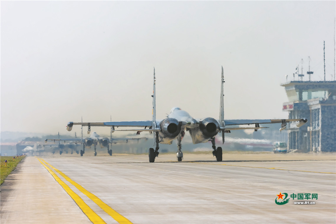 初春時(shí)節(jié),空軍航空兵某旅多架戰(zhàn)機(jī)接續(xù)滑出,梯次升空,投入海上對(duì)抗訓(xùn)練。