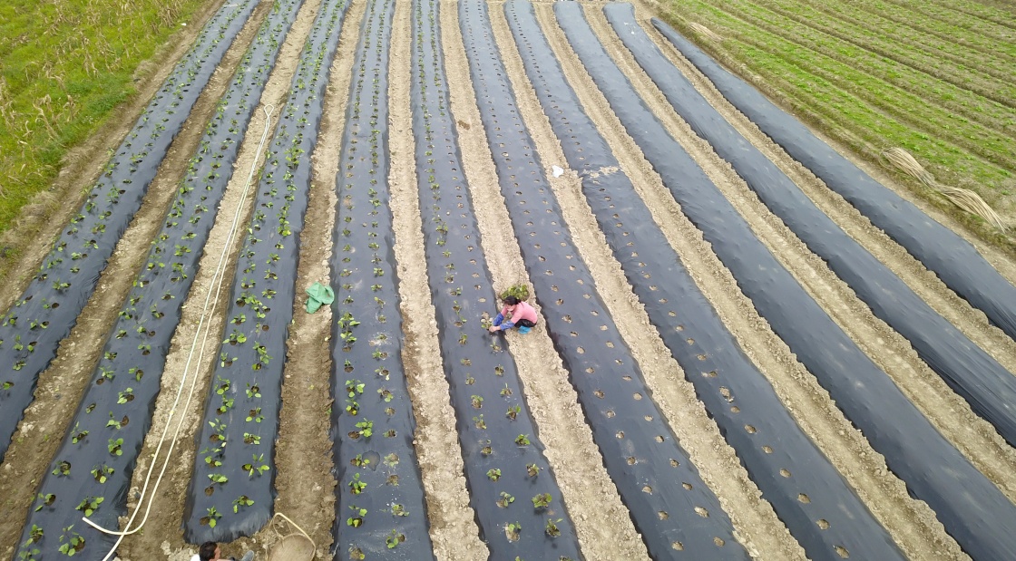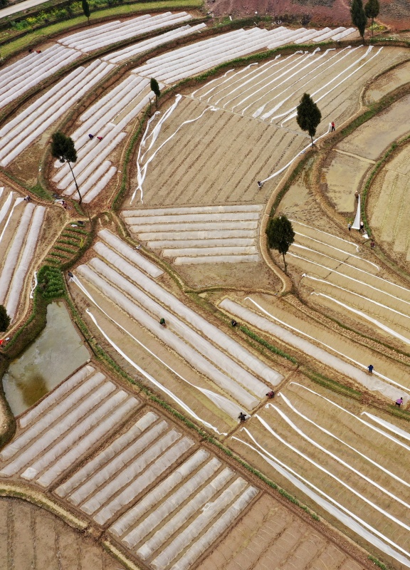 3月10日,四川省廣安市前鋒區(qū)觀塘鎮(zhèn)仁和村村民在覆蓋農(nóng)膜(無人機(jī)照片)。