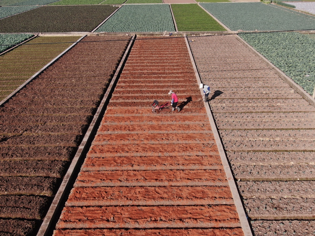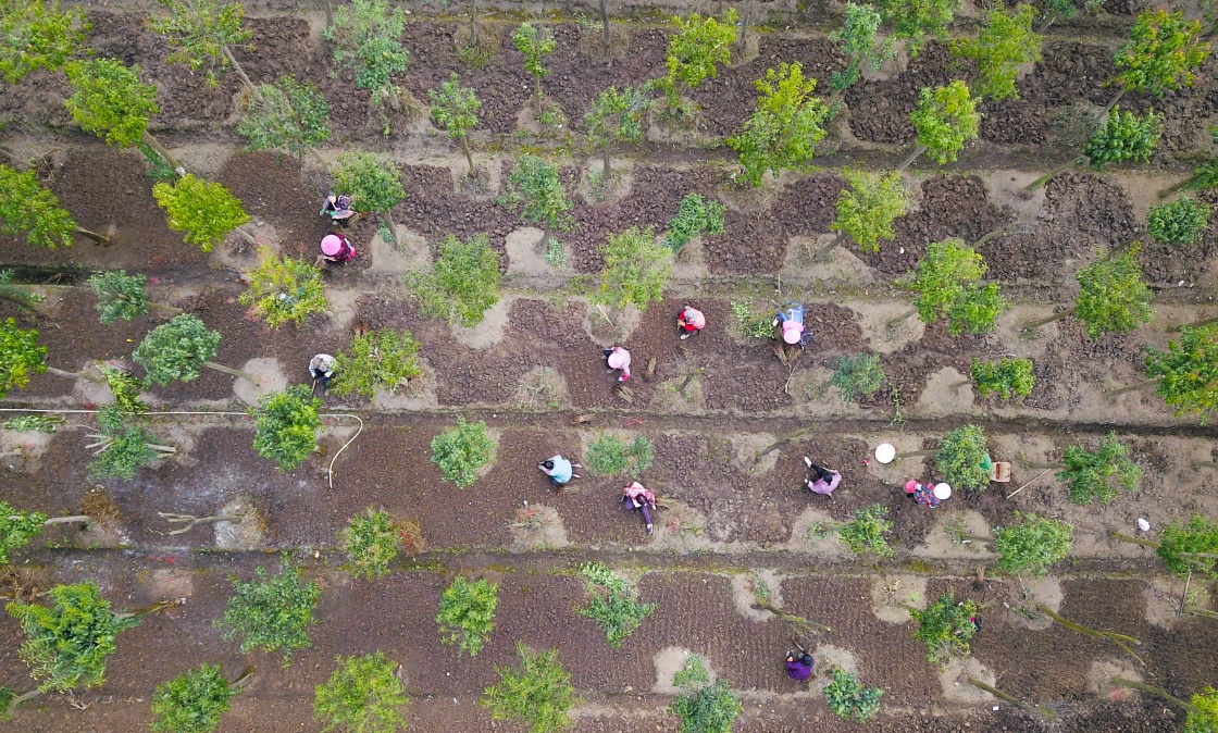 3月10日,湖北省宜昌市秭歸縣柑橘良種繁育基地的工人在進(jìn)行苗床管理作業(yè)(無人機(jī)照片)。新華社發(fā)(雷勇攝)