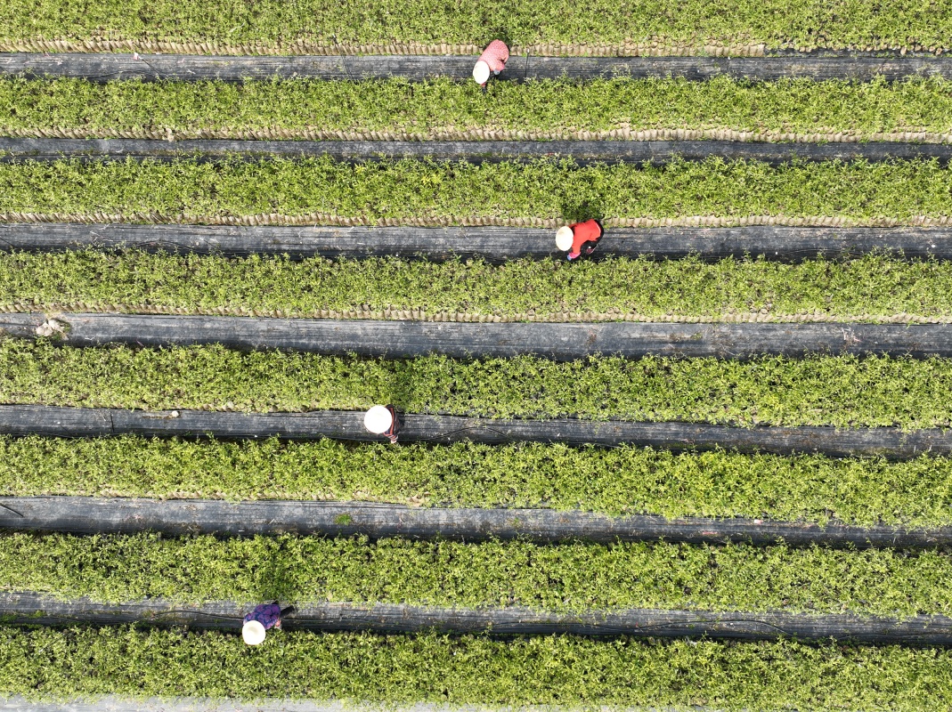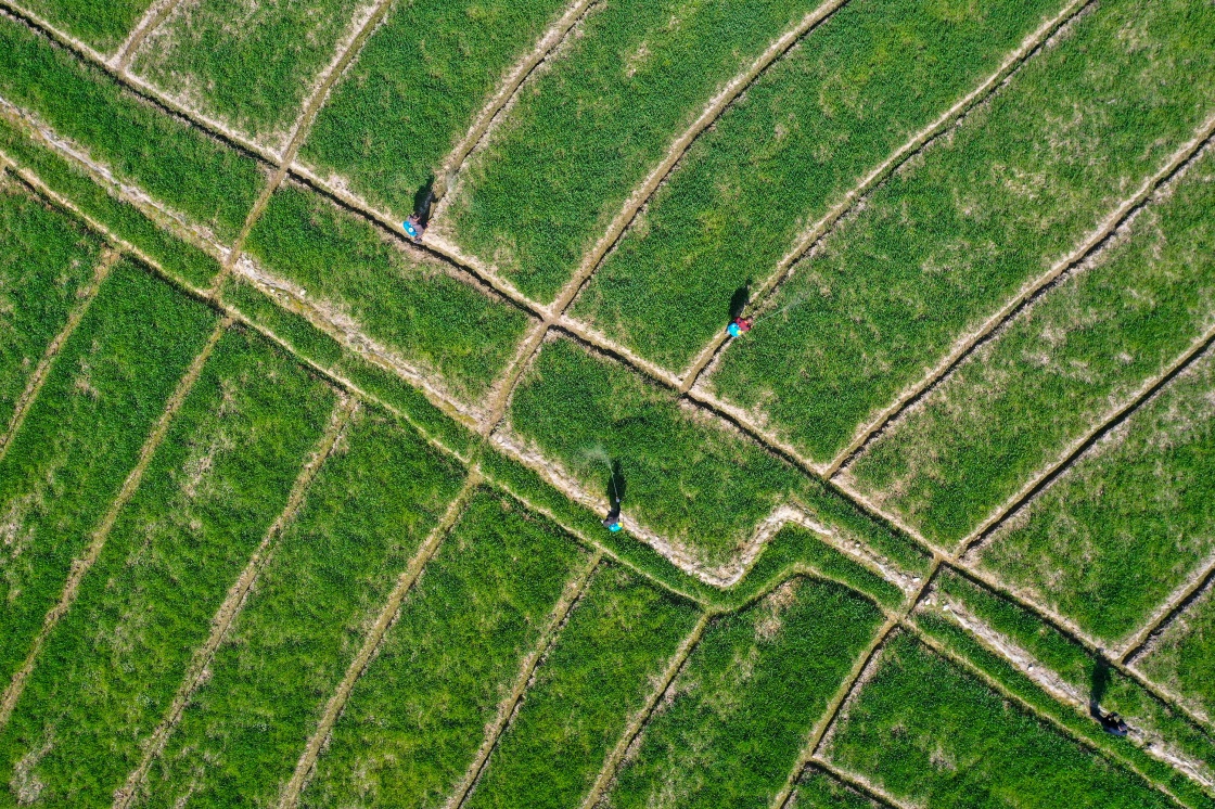 3月9日,浙江省寧波市鄞州區(qū)東吳鎮(zhèn)天童村村民在田間管護(hù)農(nóng)作物(無人機(jī)照片)。新華社發(fā)(胡學(xué)軍 攝)