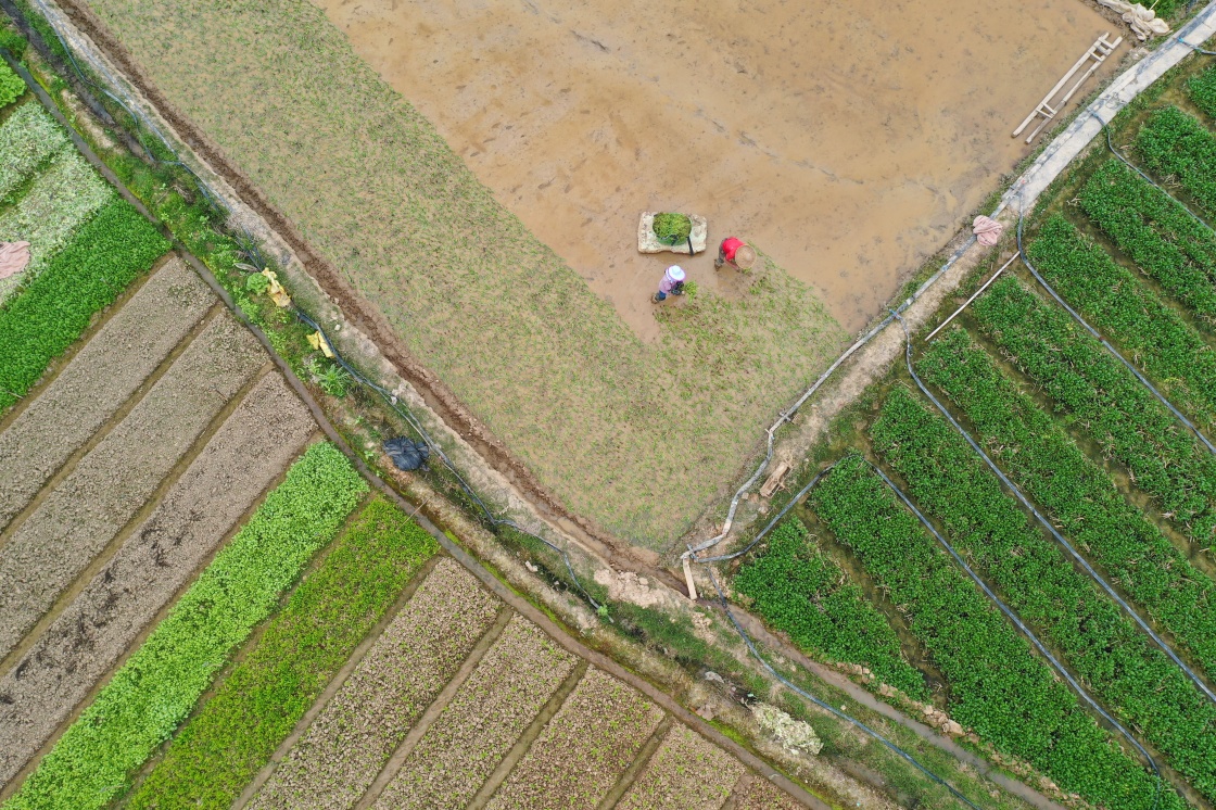 3月9日,在湖南省永州市道縣清塘鎮(zhèn),農(nóng)民在田間移栽春苗(無人機(jī)照片)。新華社發(fā)(蔣克青 攝)