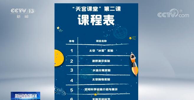 這次授課活動講什么?來看一下課程表:屆時,航天員將在軌演示太空“冰雪”實(shí)驗(yàn)、液橋演示實(shí)驗(yàn)、水油分離實(shí)驗(yàn)、太空拋物實(shí)驗(yàn),介紹與展示空間科學(xué)設(shè)施,另外還有天地互動環(huán)節(jié),航天員真誠邀請社會各界特別是廣大青少年在地面同步嘗試開展相關(guān)實(shí)驗(yàn)。