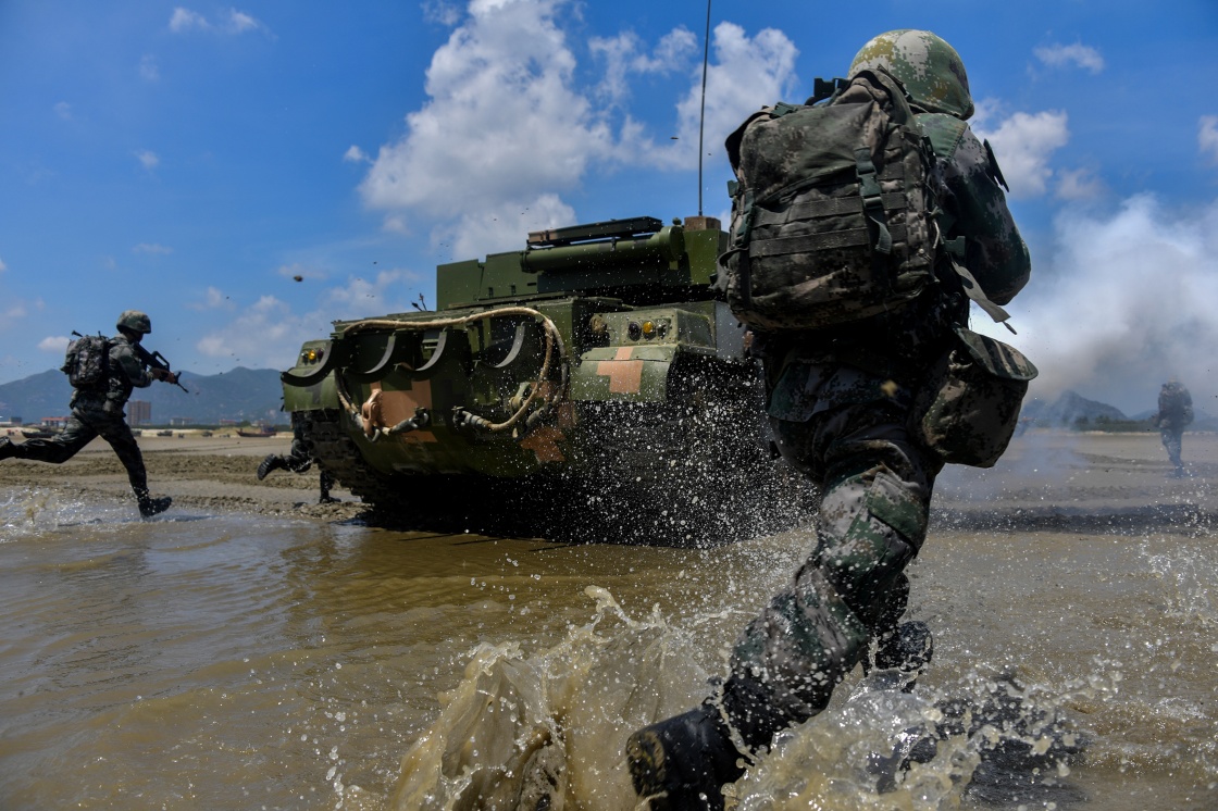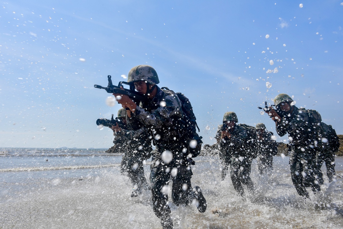 東部戰(zhàn)區(qū)陸軍第73集團(tuán)軍某旅紅四連官兵進(jìn)行搶灘登陸訓(xùn)練(7月28日攝)。新華社發(fā)(劉志勇 攝)