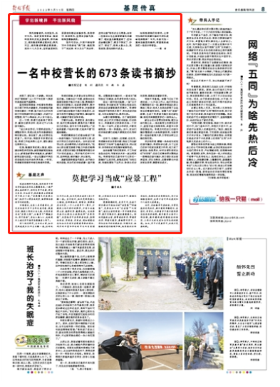 李虎把鞭策自己的理由做成了第一條讀書摘抄:“在你成為領(lǐng)導(dǎo)之前,成功只同自己的成長有關(guān)。當(dāng)你成為領(lǐng)導(dǎo)以后,成功都同別人的成長有關(guān)?!彼麤Q心抓住營黨委班子能力升級的難得機(jī)遇,在落實好旅隊思想教育和理論學(xué)習(xí)計劃的基礎(chǔ)上,用好每天的碎片時間,堅持閱讀,做好摘抄,學(xué)以致用。