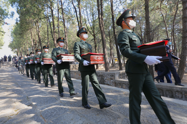 儀式上,與會(huì)嘉賓向革命烈士敬獻(xiàn)了花籃,雄壯的國(guó)歌為現(xiàn)場(chǎng)增添了莊嚴(yán)的氛圍,一紙祭文致于英烈靈前,全體人員脫帽,向革命烈士三鞠躬,由解放軍戰(zhàn)士護(hù)送的烈士棺槨覆蓋著鮮艷的五星紅旗,伴隨著《思念曲》的音樂緩緩進(jìn)入墓區(qū),在烈士家屬的注目下莊嚴(yán)下葬。