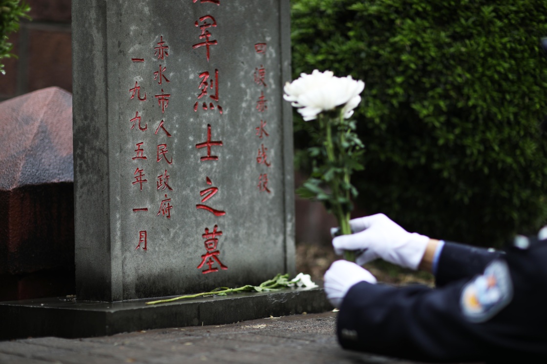 4月1日,在貴州省赤水市紅軍烈士陵園,民警向紅軍烈士墓敬獻(xiàn)鮮花。