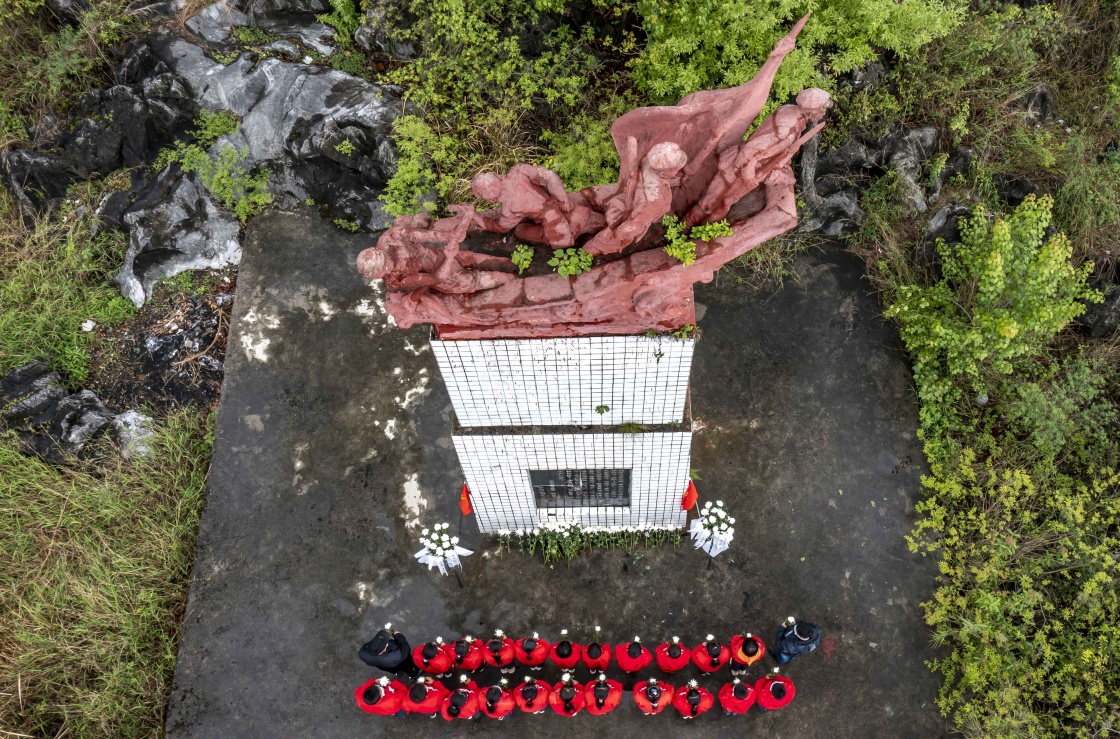 4月1日,學(xué)生在貴州省黔西市大關(guān)鎮(zhèn)紅軍搶渡鴨池河天險(xiǎn)紀(jì)念碑前默哀(無(wú)人機(jī)照片)。