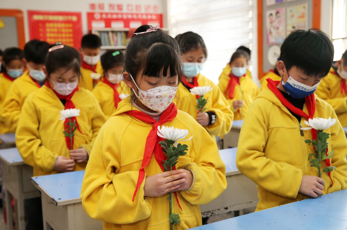 4月1日,安徽省淮北市首府實(shí)驗(yàn)小學(xué)學(xué)生手持鮮花通過教學(xué)網(wǎng)絡(luò)向英烈默哀。