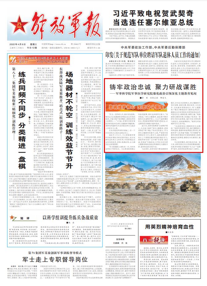 牢記統(tǒng)帥囑托,鑄牢政治忠誠(chéng)。連日來,該研究院官兵以昂揚(yáng)的精神面貌,向更多軍事醫(yī)學(xué)領(lǐng)域的“無人區(qū)”“高寒帶”進(jìn)軍,加快科技成果向戰(zhàn)斗力轉(zhuǎn)化。