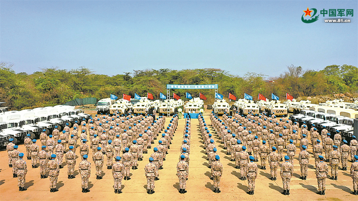 我第8批赴南蘇丹(朱巴)維和步兵營官兵在營區(qū)廣場莊嚴肅立。孫雪松攝