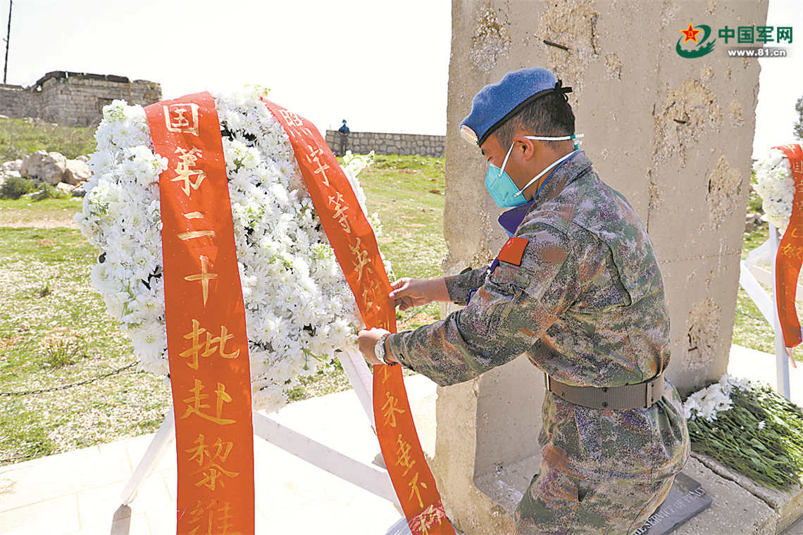 我第20批赴黎巴嫩維和部隊官兵代表為烈士敬獻花圈。梁裕源攝