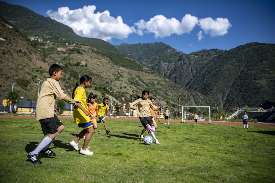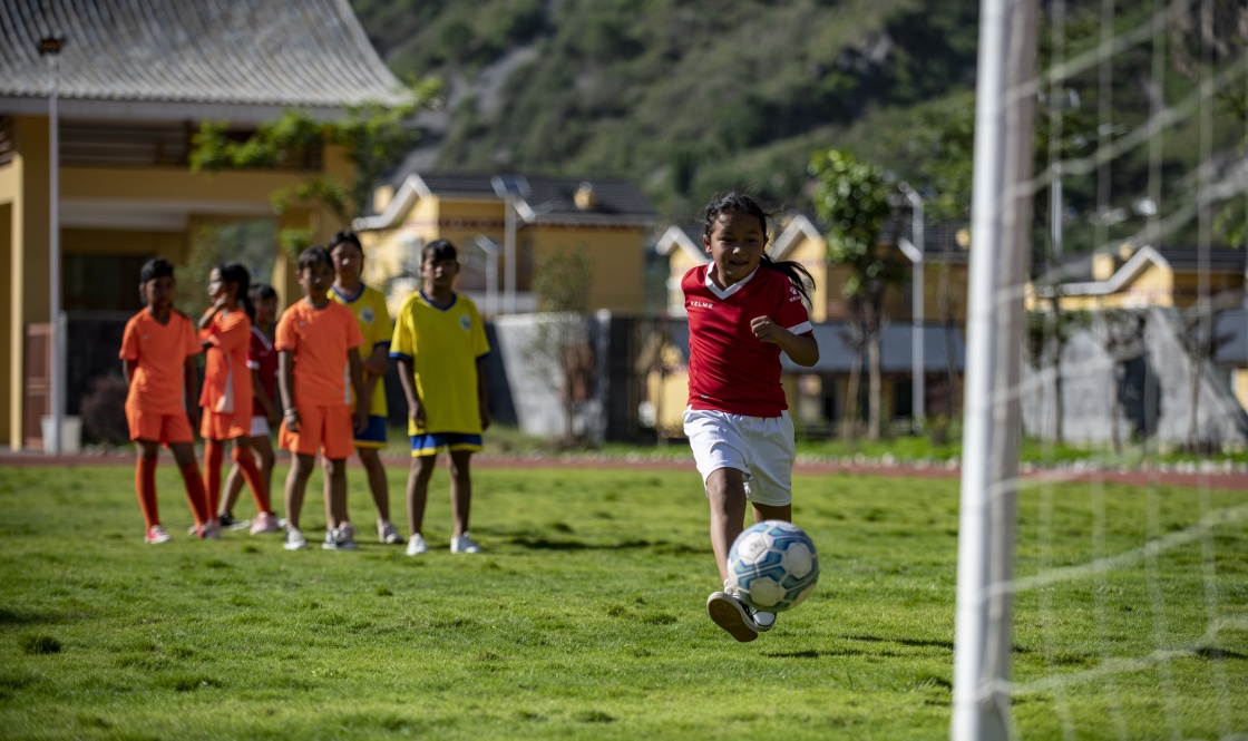 云南省怒江傈僳族自治州瀘水市大興地鎮(zhèn)格力小學(xué)學(xué)生在球場上踢足球(2020年5月18日攝)。新華社記者 江文耀 攝