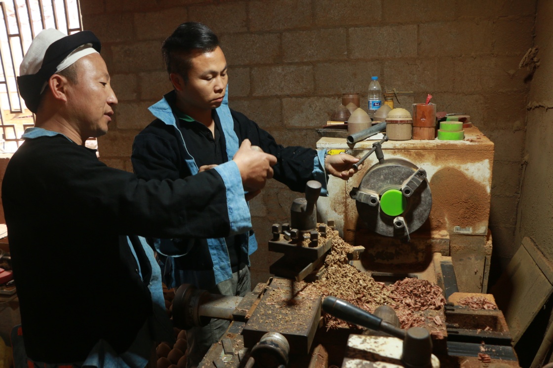 謝友明(左)跟徒弟在趕制陀螺(4月6日攝)。新華社記者 齊健 攝