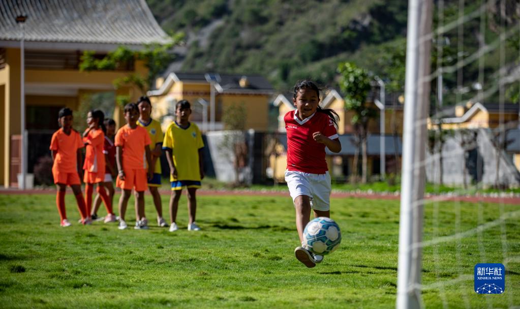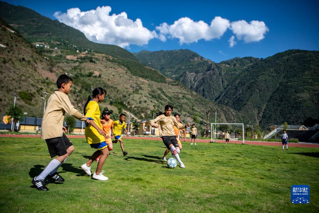 云南省怒江傈僳族自治州瀘水市大興地鎮(zhèn)格力小學(xué)學(xué)生在球場上踢足球(2020年5月18日攝)。新華社記者 江文耀 攝