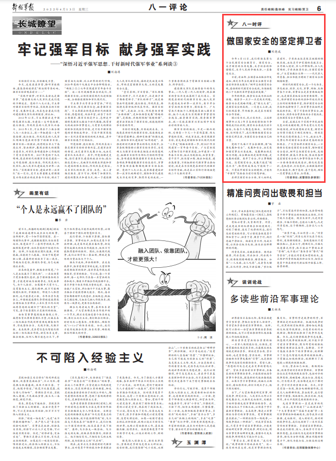 當前,我國正處于實現(xiàn)中華民族偉大復(fù)興的關(guān)鍵時期,百年未有之大變局加速演進,世紀疫情跌宕反復(fù),國家安全形勢不穩(wěn)定不確定性增大。特別是今年我們黨將迎來二十大,政治之年、大事之年對國家安全提出更高的標準和要求。廣大官兵捍衛(wèi)國家安全,一方面要自覺接受國家安全教育,增加國家安全意識,樹牢總體國家安全觀,發(fā)揚斗爭精神、提高斗爭本領(lǐng),堅決同各種危害國家安全的人和事作堅決斗爭;另一方面要堅持底線意識,強化憂患意識、危機意識、打仗意識,全面提高新時代打贏能力,敢于亮劍、善于亮劍,確保一旦有事能上得去、打得贏。