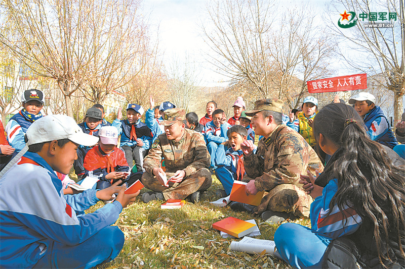 ?4月8日,西藏山南軍分區(qū)某團(tuán)官兵為學(xué)生們講解《國家安全教育·小學(xué)生讀本》。 劉星呈攝