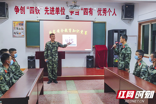 “遇到類似索要軍裝照的行為,我們應(yīng)該怎么做呢?”4月14日,在武警婁底支隊(duì)舉辦的全民國家安全教育日“以案釋法”活動現(xiàn)場,“紅肩章”講解員金人玉正在結(jié)合掛圖講解現(xiàn)實(shí)案例,為官兵解讀相關(guān)法律法規(guī)條文。這是支隊(duì)開展全民國家安全教育日系列活動中的一個部分。