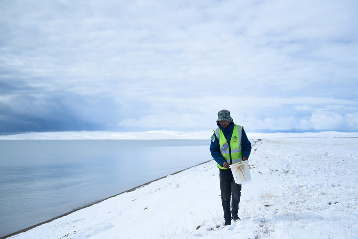 2021年10月,三江源國家公園黃河源園區(qū)生態(tài)管護員俄措在扎陵湖邊撿拾垃圾。新華社記者張龍攝