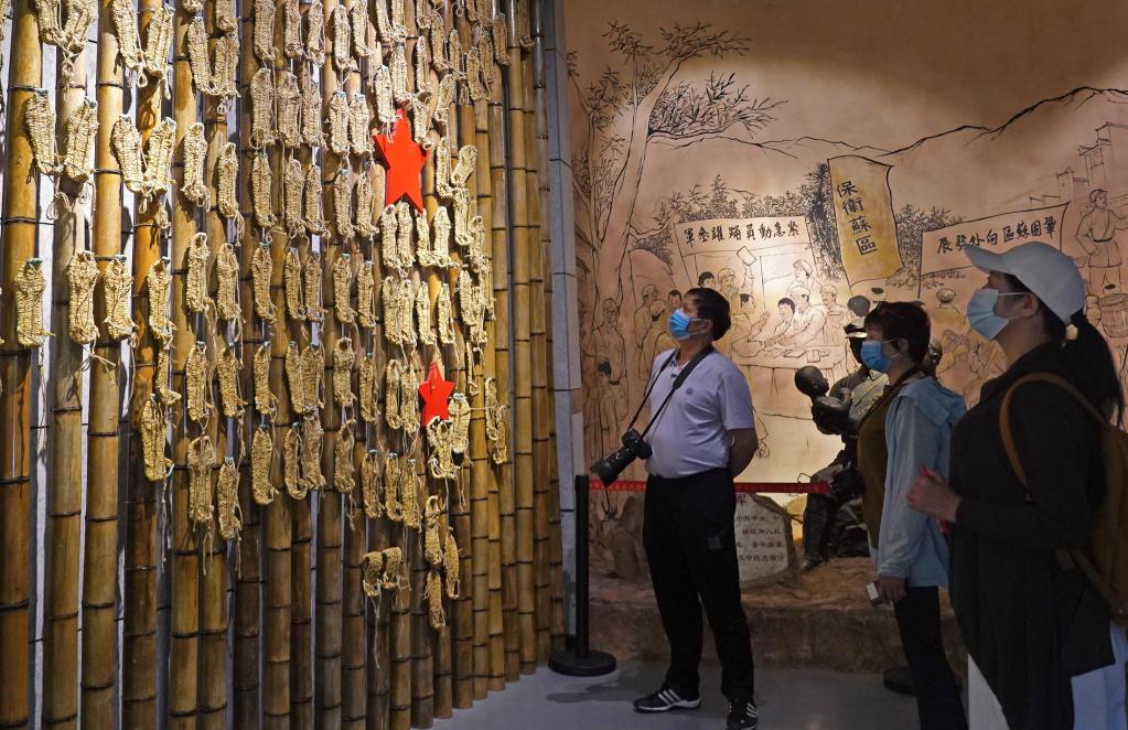 在江西省于都縣中央紅軍長征出發(fā)紀念館,游客參觀草鞋組成的“草鞋墻”(2021年4月30日攝)。新華社記者萬象攝