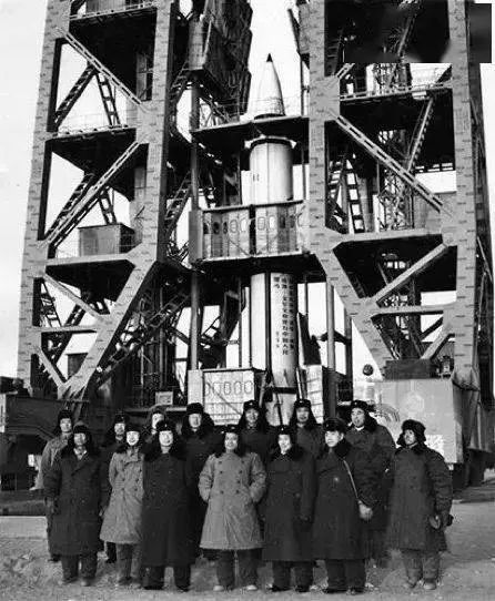 聶榮臻(前排左3)、錢(qián)學(xué)森(前排左2)、任新民(前排左1)在東風(fēng)三號(hào)導(dǎo)彈發(fā)射現(xiàn)場(chǎng)