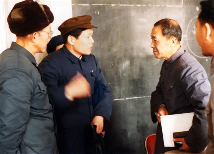 黃緯祿(左一)在試驗(yàn)基地廠房?jī)?nèi)向原國(guó)防科工委及航天工業(yè)部領(lǐng)導(dǎo)介紹情況