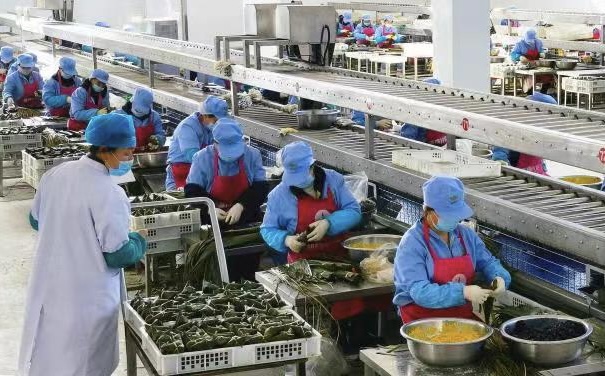 這幾年,青塘粽子從過去的節(jié)令食品,變成一年四季不愁賣的美食,村民們靠著小小的粽子改變了命運。在村里的粽子加工廠,53歲的村民王金蓮動作麻利,包好一個粽子僅僅需要15秒?!艾F(xiàn)在每個月能掙五六千元?!彼f,在家門口打工,掙錢不少,還方便照顧家里。