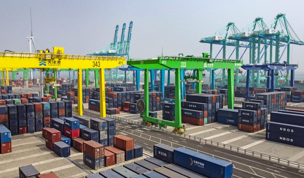 這是4月9日拍攝的天津港北疆港區(qū)C段智能化集裝箱碼頭(無人機(jī)照片)。新華社記者趙子碩攝