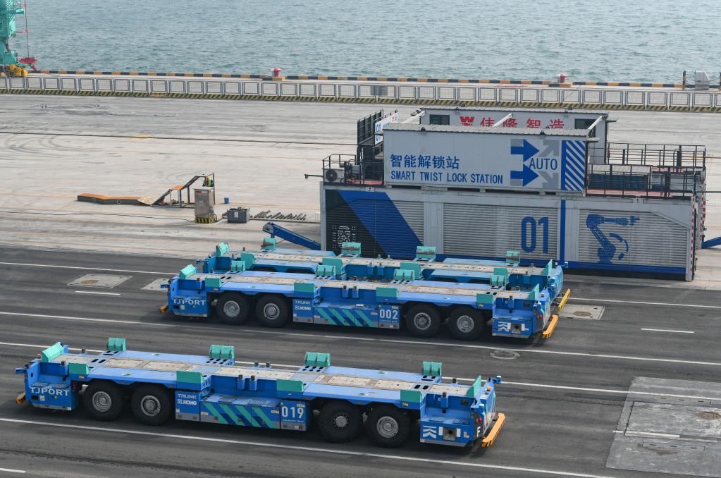 4月9日,這是在天津港北疆港區(qū)C段智能化集裝箱碼頭拍攝的智能水平運(yùn)輸機(jī)器人和智能解鎖站。新華社記者孫凡越攝