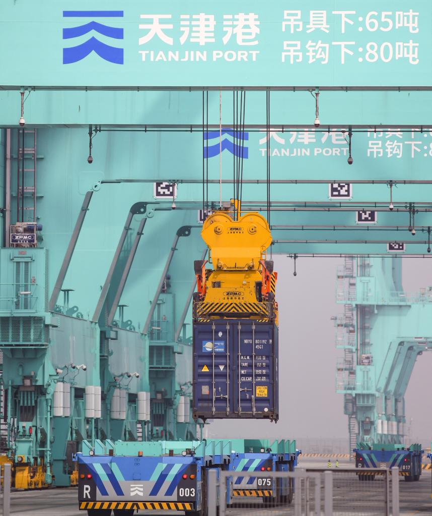 4月9日,在天津港北疆港區(qū)C段智能化集裝箱碼頭,岸橋在進(jìn)行集裝箱裝卸作業(yè)。新華社記者孫凡越攝