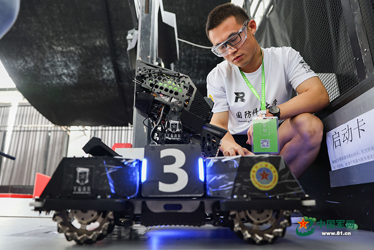 二十隊學員陳昭在2021機甲大賽對抗賽上調試機器人。 趙浩君 攝