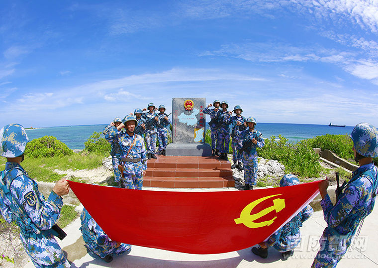 海軍西沙某水警區(qū)組織官兵在主權碑前向黨旗宣誓。趙向虎 攝