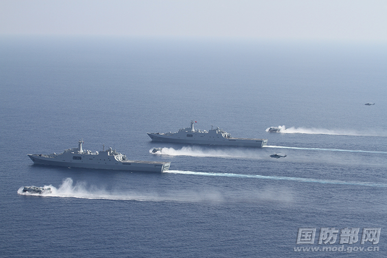 海軍船塢登陸艦昆侖山艦和井岡山艦進行實戰(zhàn)化訓練。甘俊攝??