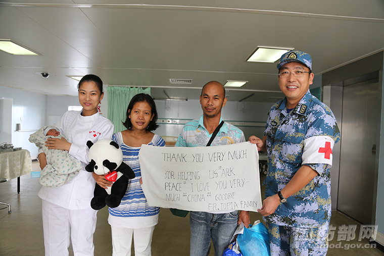 菲律賓夫婦在海軍“和平方舟”號醫(yī)院船上誕下嬰兒,對海軍醫(yī)療隊員表示感謝。王鐵剛攝