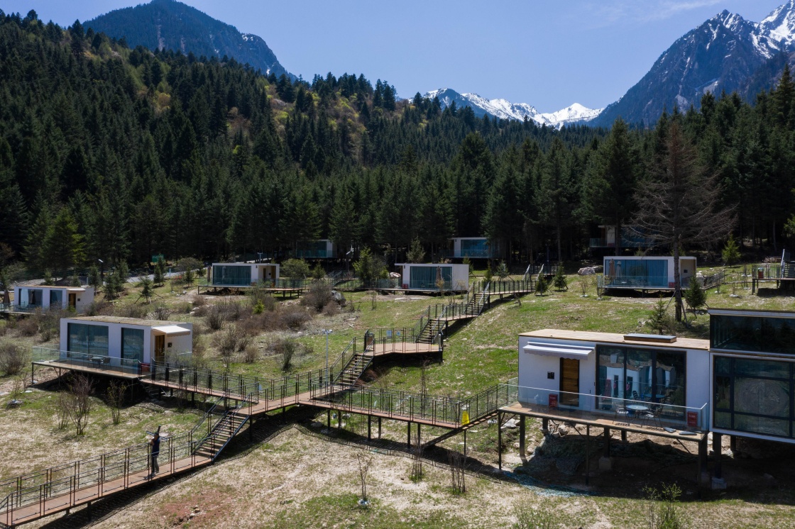 4月25日拍攝的中查溝森林中搭建的裝配式酒店(無人機(jī)照片)。