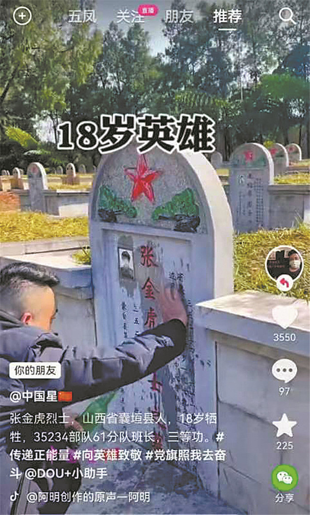 4月23日,抖音平臺“中國星”賬號更新一條短視頻。視頻中,博主走進云南蒙自烈士陵園,伴隨著悲壯的背景音樂,他把鏡頭對準三等功臣李沙娘烈士的墓碑,講述當年李沙娘奮勇殺敵、血灑南疆的故事,受到眾多網(wǎng)友的關注和點贊。這是該賬號發(fā)布的第352個緬懷英雄烈士的短視頻。