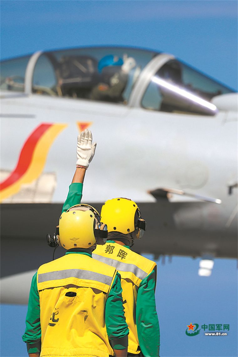 遼寧艦航空部門起降中隊(duì)副中隊(duì)長郭暉和戰(zhàn)友一起放飛殲-15艦載戰(zhàn)斗機(jī)。